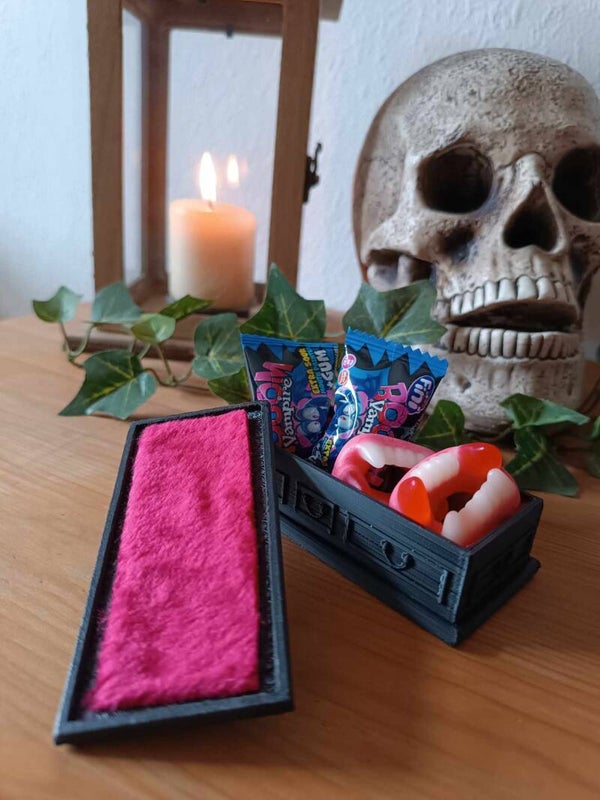 Mit diesem kleinen gruseligen Sarg seit ihr garantiert das Highlight auf jeder Halloween oder Gothic Party.